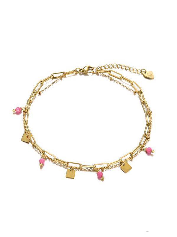 Wauw! Hoe schattig is dit gouden enkelbandje. Het bandje heeft twee laagjes voorzien met kraaltjes in roze kleur en blokjes! Superleuk om deze enkelband te combineren met meerdere enkelbandjes of meerdere sieraden.