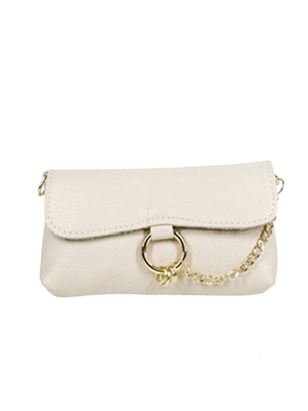 Leuk tasje in het creme. Dit tasje is van soepel en zacht leer en heeft een ring met ketting aan de voorkant.
