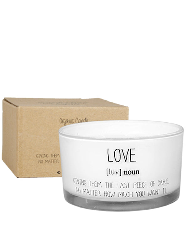 Sojakaars Love - een heerlijke geurkaars gemaakt van biologische sojawas. Deze kaars heeft de geur Fresh Cotton en brandt ca. 35 uur.