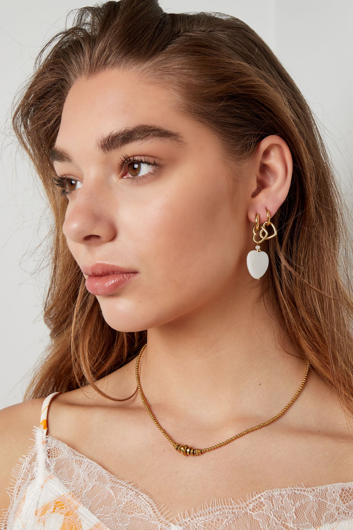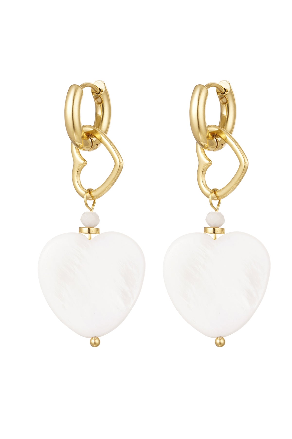 Wauw! Hoe tof zijn deze statement oorbellen met leuke gouden hartje en een leuk wit groter hart en schattig kraaltjes! Superleuk te dragen tijdens een tof festival of heerlijk avondje terrassen. Wij zijn helemaal verliefd en combineren deze oorbellen graag met meerdere sieraden met witte details! Ook leuk om deze oorbellen te combineren met meerdere kleurrijke accessoires. De oorbellen zijn gemaakt van Stainless steel in combinatie met zeeschelp en kristalkraaltje en hebben een afmeting van 4,7 cm.