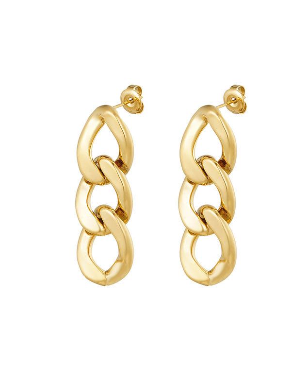 Hoe tof zijn deze gouden oorbellen in de vorm van drie schakels! Mega trendy en superleuk te combineren met meerdere matchende oorbellen of andere sieraden.