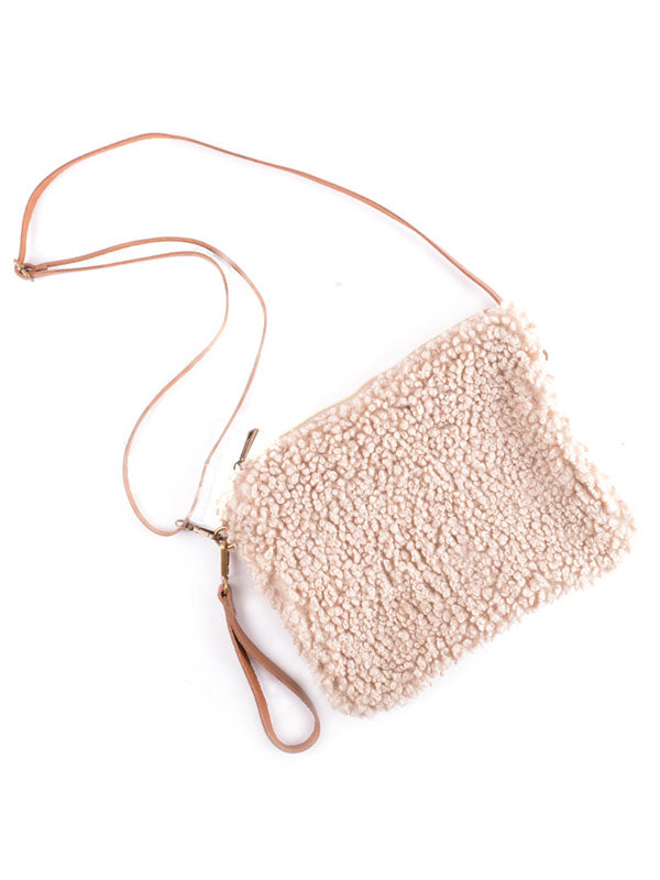 Leuke lederen schoudertasje met Teddy stof. De tas heeft een dunne schouderband.